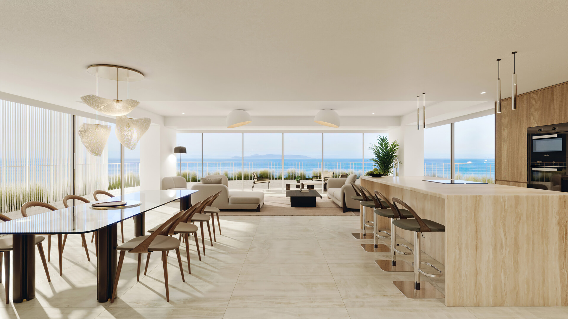 Binanın dalga formundan ilham alan modern mimarisi, denizin akışkanlığını ve zarafetini yansıtır. Geniş kıvrımlı teraslar ve yeşil alanlar, doğayla mükemmel bir uyum yaratır.
